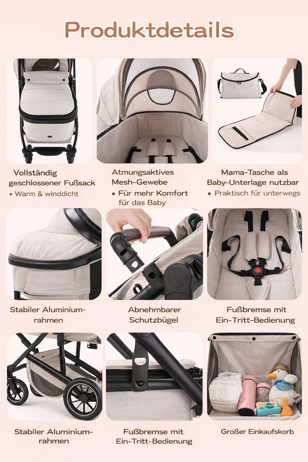 - 🔄 3-in-1 Kinderwagen-System – vielseitig nutzbar für verschiedene Altersstufen